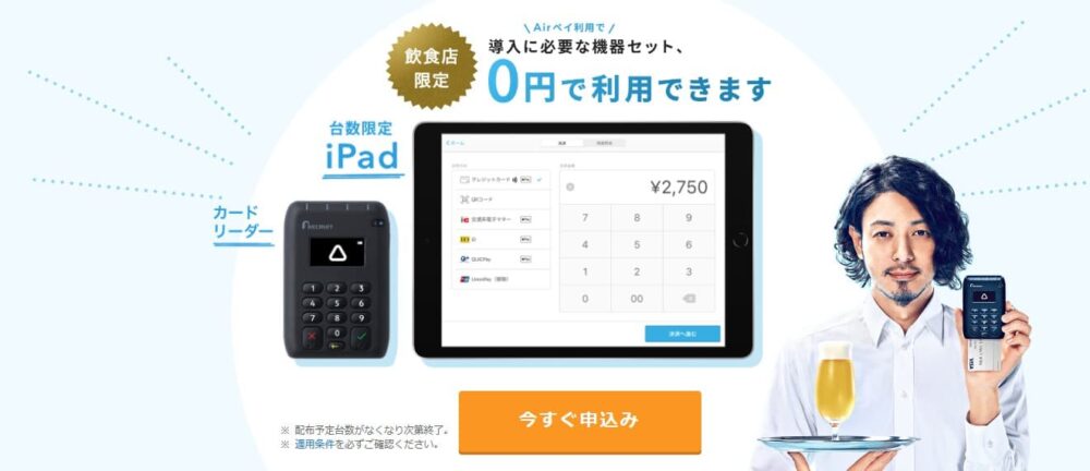 現在Airペイでは、飲食店様で限定で新規申込者向けに「iPadとカードリーダー」が無料で貸与されるキャンペーンを実施しています。