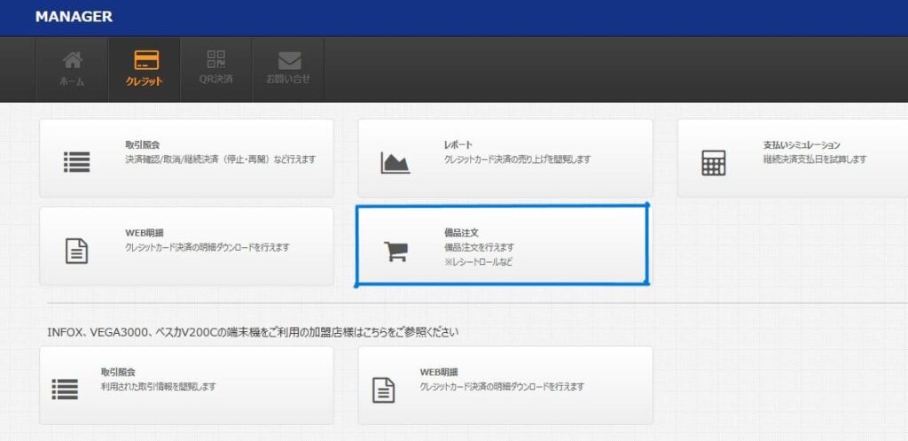 TOPページの上部にある【クレジット】を選択しその後【備品注文】を選択するとロール紙などの注文ができるようになっております。