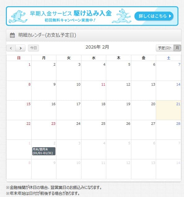 - 入金日が土日祝と被った場合は、翌営業日となります。支払日が31日(土)の場合 → 実際の入金は翌月2日(月)