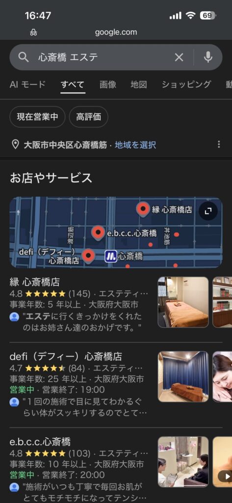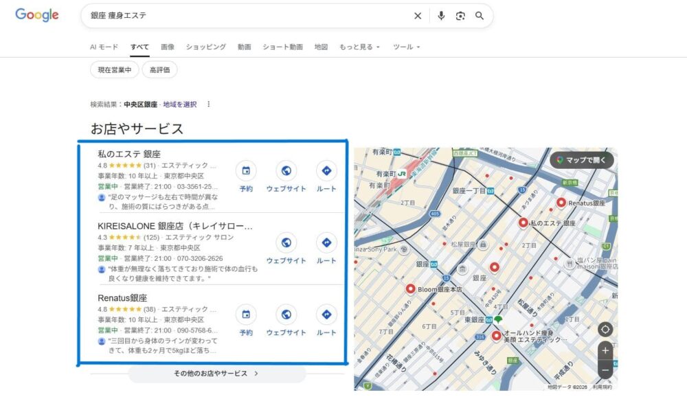 Googleで「地域名 + エステ」と検索すると、通常のウェブサイト(SEO枠)や広告よりも上に「マップ枠(ローカルパック)」が表示されます。スマホ画面の1画面目をほぼ独占できるため、クリック率はSEOよりも遥かに高くなります。