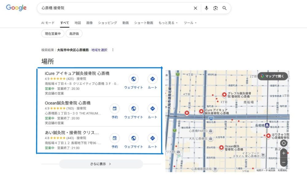 接骨院の商圏は、一般的に半径2〜3km圏内と言われています。Googleマップの検索結果は「現在地」に強く連動するため、商圏内のユーザーに対してピンポイントでアピールできます。